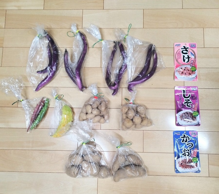 写真は野菜釣りの収穫と、クジで当たったふりかけです。
